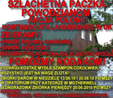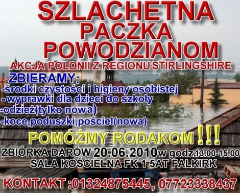 "Tragedia jaka spotkała rodaków w Polsce dotknęła nas wszystkich. Powódź zabrała wielu cały dobytek życia. Dlatego organizacje polonijne, sklepy polskie oraz prywatni przedsiębiorcy z regionów North&South Lanarkshire i Stirlingshire postanowili razem działać i rozpocząć zbiórkę darów dla powodzian. Chcemy pomóc i prosimy wszystkich którzy czuja to samo o przybycie z darami" - apelują organizatorzy akcji.