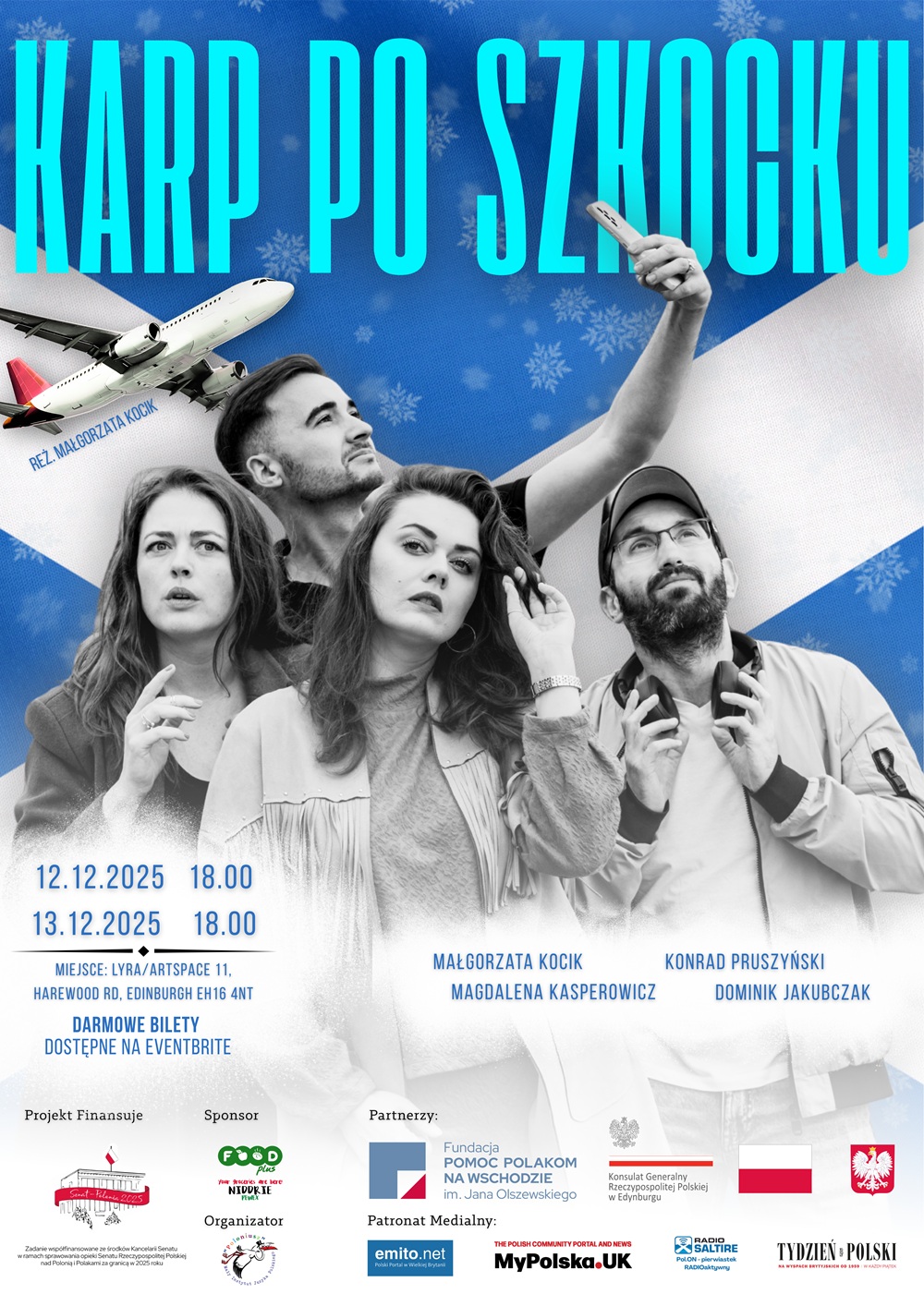 Trzech nieznajomych, trzy charaktery i jedno lotnisko tuż przed Bożym Narodzeniem. Co się stanie, gdy pech połączy przypadkowych pasażerów w świąteczny wieczór – daleko od domu? Przekonaj się podczas spektaklu „Karp po szkocku”, który 12 i 13 grudnia będzie pokazany w Edynburgu.