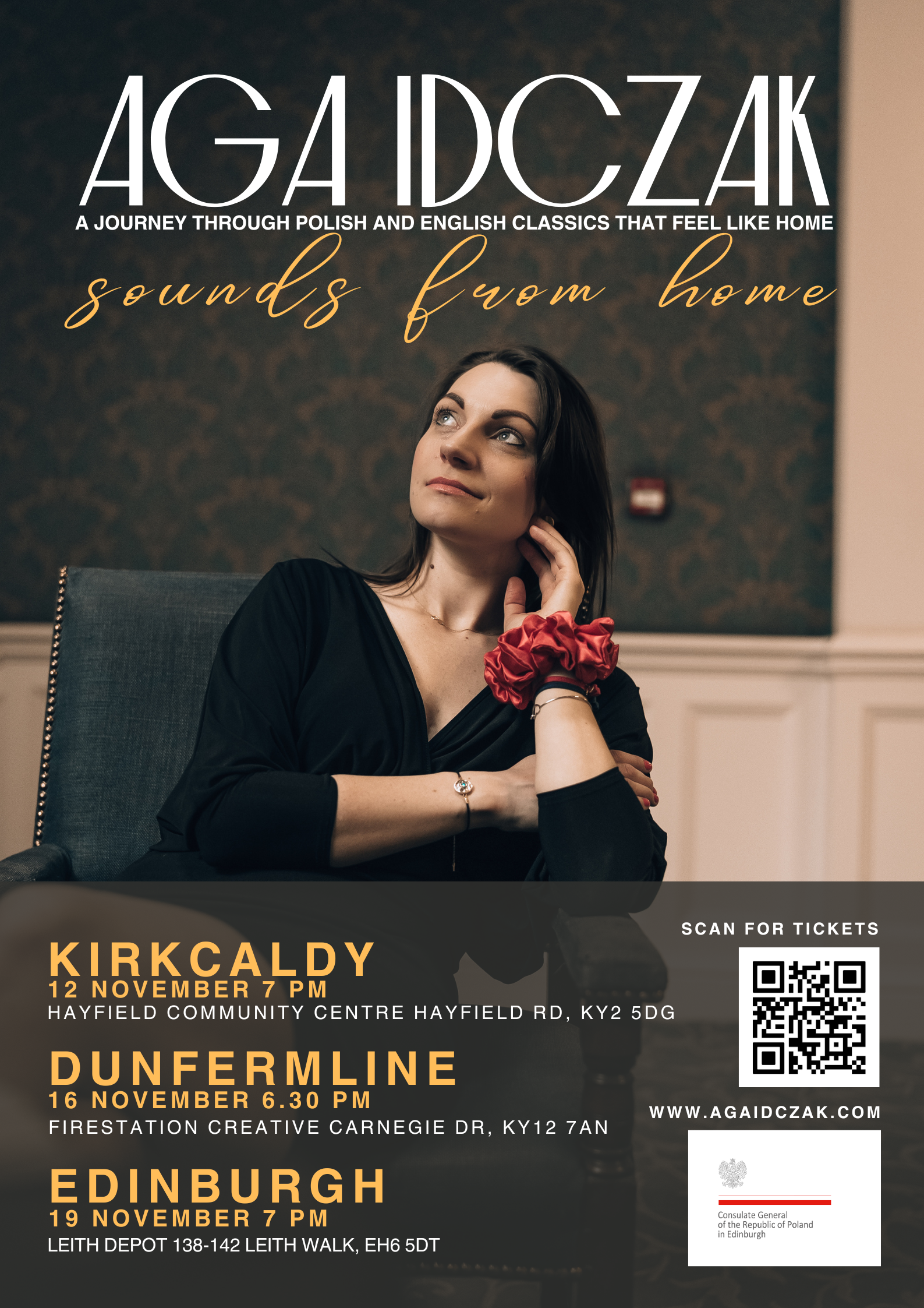 Wokalistka i pianistka Aga Idczak w listopadzie 2025 roku odwiedza trzy szkockie miasta – Kirkcaldy, Dunfermline i Edynburg – z autorskim projektem „Sounds from Home”. To muzyczna podróż przez utwory, które brzmią jak dom – zarówno te dobrze znane z Polski, jak i te zakorzenione w brytyjskiej kulturze.