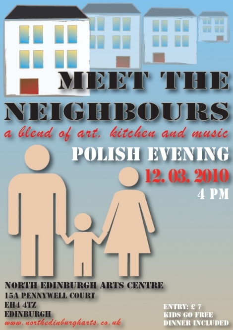 Pierwsze spotaknie z cyklu "Meet the neigbours" to swoistego rodzaju "wprowadzenie". Opowiemy naszym przyjaciołom o Polsce, o polskiej sztuce w Edynburgu, pokażemy filmy reklamujace nasz kraj. Podczas spotkania zaprosimy ich do skosztowania polskich specjałów ( z których tak jesteśmy dumni), jak bigos, pierogi czy naleśniki. O oprawę muzyczną zadba znany i lubiany w stolicy Szkocji Grzegorz Łapiński, czyli DJ Łapa.